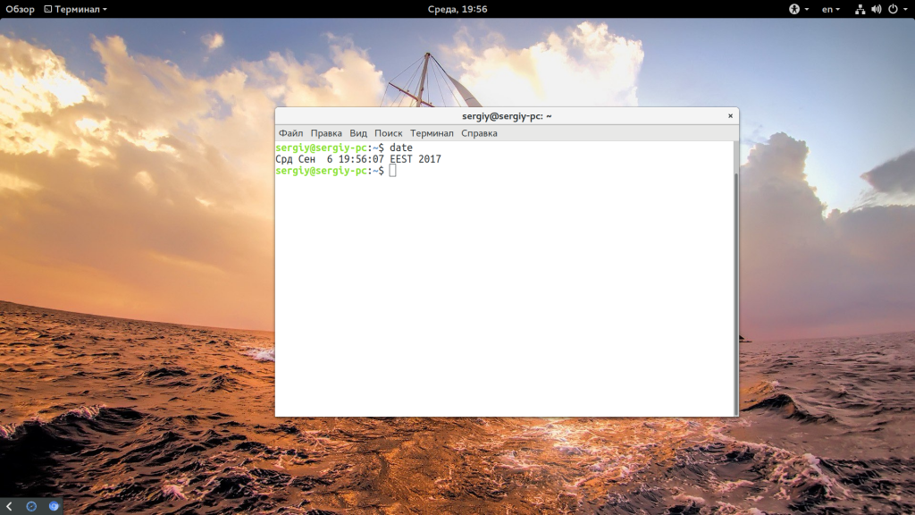 Кроме графического интерфейса, у вас есть возможность делать все необходимые действия через терминал. Для этого есть утилита date. Сначала смотрим текущее время: