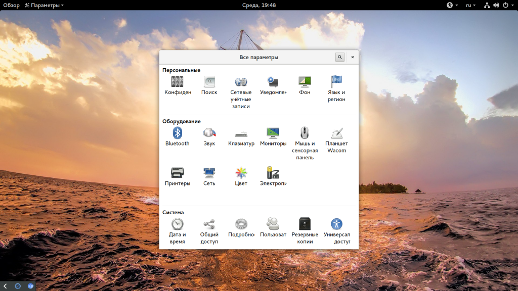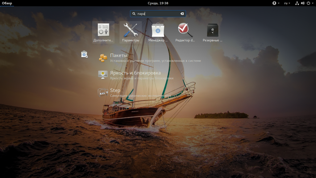 Но настроить время здесь уже не получится. Для этого нужно открывать настройки системы. Мы будем рассматривать настройки для Gnome. Откройте меню Dash и наберите в строке поиска «Параметры»: