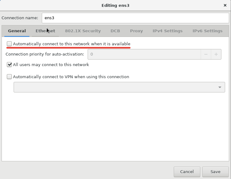 В главной вкладке, нужно отметить галочкой “Automatically connect to this network when it is available”, это нужно для того, чтобы сетевой интерфейс поднимался автоматически.
