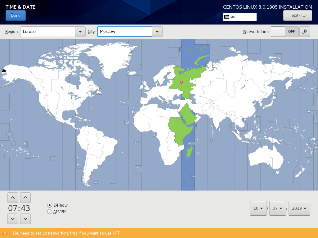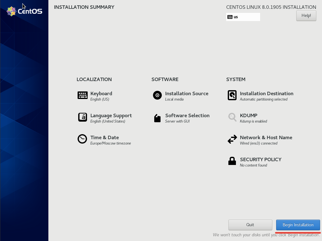 Для запуска установки, обязательно настроить только один пункт “Installation Destination”, там вы указываете разбивку диска, но я предпочитаю так же, сразу настроить сеть и дату со временем.