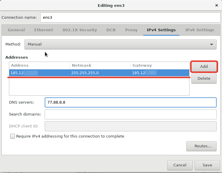 Для ввода конкретного IP, нужно выбрать метод “Manual” и нажать кнопку “Add”, после чего у вас появится возможность ввести нужные данные. Сохранив все, мы вернемся к начальному окну настроек сети