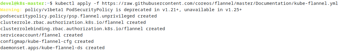 Warning: policy/v1beta1 PodSecurityPolicy is deprecated in v1.21+, unavailable in v1.25+ podsecuritypolicy.policy/psp.flannel.unprivileged created clusterrole.rbac.authorization.k8s.io/flannel created clusterrolebinding.rbac.authorization.k8s.io/flannel created serviceaccount/flannel created configmap/kube-flannel-cfg created daemonset.apps/kube-flannel-ds created