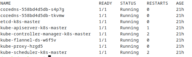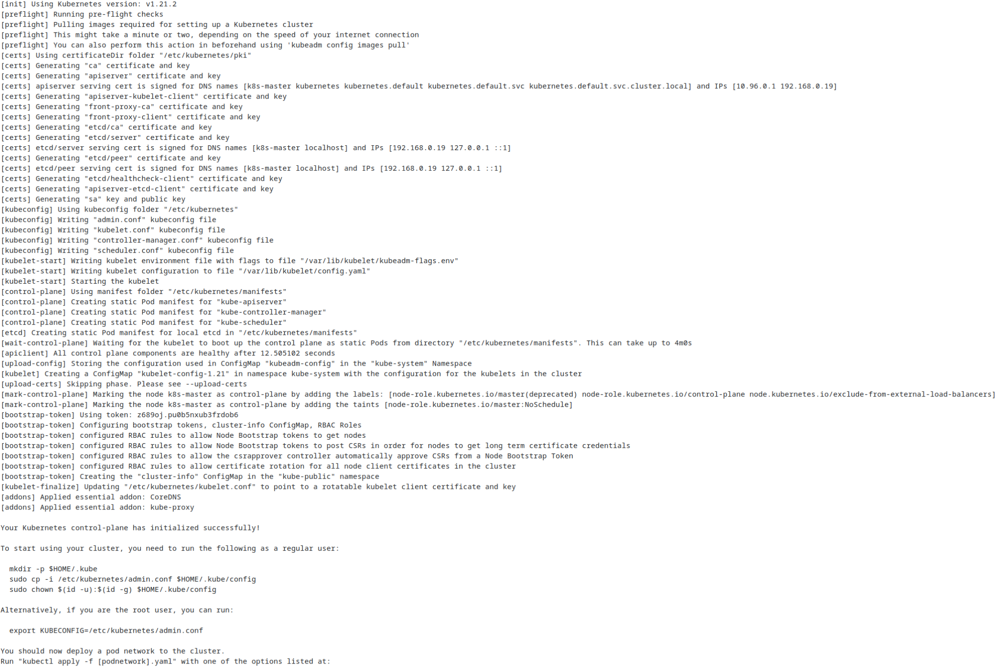 [init] Using Kubernetes version: v1.21.2 [preflight] Running pre-flight checks [preflight] Pulling images required for setting up a Kubernetes cluster [preflight] This might take a minute or two, depending on the speed of your internet connection [preflight] You can also perform this action in beforehand using 'kubeadm config images pull' [certs] Using certificateDir folder "/etc/kubernetes/pki" [certs] Generating "ca" certificate and key [certs] Generating "apiserver" certificate and key [certs] apiserver serving cert is signed for DNS names [k8s-master kubernetes kubernetes.default kubernetes.default.svc kubernetes.default.svc.cluster.local] and IPs [10.96.0.1 192.168.0.19] [certs] Generating "apiserver-kubelet-client" certificate and key [certs] Generating "front-proxy-ca" certificate and key [certs] Generating "front-proxy-client" certificate and key [certs] Generating "etcd/ca" certificate and key [certs] Generating "etcd/server" certificate and key [certs] etcd/server serving cert is signed for DNS names [k8s-master localhost] and IPs [192.168.0.19 127.0.0.1 ::1] [certs] Generating "etcd/peer" certificate and key [certs] etcd/peer serving cert is signed for DNS names [k8s-master localhost] and IPs [192.168.0.19 127.0.0.1 ::1] [certs] Generating "etcd/healthcheck-client" certificate and key [certs] Generating "apiserver-etcd-client" certificate and key [certs] Generating "sa" key and public key [kubeconfig] Using kubeconfig folder "/etc/kubernetes" [kubeconfig] Writing "admin.conf" kubeconfig file [kubeconfig] Writing "kubelet.conf" kubeconfig file [kubeconfig] Writing "controller-manager.conf" kubeconfig file [kubeconfig] Writing "scheduler.conf" kubeconfig file [kubelet-start] Writing kubelet environment file with flags to file "/var/lib/kubelet/kubeadm-flags.env" [kubelet-start] Writing kubelet configuration to file "/var/lib/kubelet/config.yaml" [kubelet-start] Starting the kubelet [control-plane] Using manifest folder "/etc/kubernetes/manifests" [control-plane] Creating static Pod manifest for "kube-apiserver" [control-plane] Creating static Pod manifest for "kube-controller-manager" [control-plane] Creating static Pod manifest for "kube-scheduler" [etcd] Creating static Pod manifest for local etcd in "/etc/kubernetes/manifests" [wait-control-plane] Waiting for the kubelet to boot up the control plane as static Pods from directory "/etc/kubernetes/manifests". This can take up to 4m0s [apiclient] All control plane components are healthy after 12.505102 seconds [upload-config] Storing the configuration used in ConfigMap "kubeadm-config" in the "kube-system" Namespace [kubelet] Creating a ConfigMap "kubelet-config-1.21" in namespace kube-system with the configuration for the kubelets in the cluster [upload-certs] Skipping phase. Please see --upload-certs [mark-control-plane] Marking the node k8s-master as control-plane by adding the labels: [node-role.kubernetes.io/master(deprecated) node-role.kubernetes.io/control-plane node.kubernetes.io/exclude-from-external-load-balancers] [mark-control-plane] Marking the node k8s-master as control-plane by adding the taints [node-role.kubernetes.io/master:NoSchedule] [bootstrap-token] Using token: z689oj.pu0b5nxub3frdob6 [bootstrap-token] Configuring bootstrap tokens, cluster-info ConfigMap, RBAC Roles [bootstrap-token] configured RBAC rules to allow Node Bootstrap tokens to get nodes [bootstrap-token] configured RBAC rules to allow Node Bootstrap tokens to post CSRs in order for nodes to get long term certificate credentials [bootstrap-token] configured RBAC rules to allow the csrapprover controller automatically approve CSRs from a Node Bootstrap Token [bootstrap-token] configured RBAC rules to allow certificate rotation for all node client certificates in the cluster [bootstrap-token] Creating the "cluster-info" ConfigMap in the "kube-public" namespace [kubelet-finalize] Updating "/etc/kubernetes/kubelet.conf" to point to a rotatable kubelet client certificate and key [addons] Applied essential addon: CoreDNS [addons] Applied essential addon: kube-proxy Your Kubernetes control-plane has initialized successfully! To start using your cluster, you need to run the following as a regular user: mkdir -p $HOME/.kube sudo cp -i /etc/kubernetes/admin.conf $HOME/.kube/config sudo chown $(id -u):$(id -g) $HOME/.kube/config Alternatively, if you are the root user, you can run: export KUBECONFIG=/etc/kubernetes/admin.conf You should now deploy a pod network to the cluster. Run "kubectl apply -f [podnetwork].yaml" with one of the options listed at: https://kubernetes.io/docs/concepts/cluster-administration/addons/ Then you can join any number of worker nodes by running the following on each as root: kubeadm join 192.168.0.19:6443 --token z689oj.pu0b5nxub3frdob6 --discovery-token-ca-cert-hash sha256:0c91b280545ca27699da492ee24ba0db2630f97d6fc3795e9bed7c585df56451