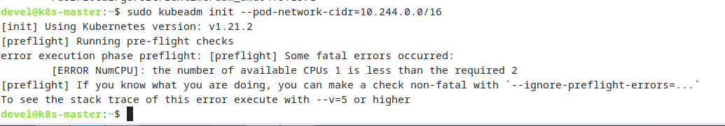 [init] Using Kubernetes version: v1.21.2 [preflight] Running pre-flight checks error execution phase preflight: [preflight] Some fatal errors occurred: [ERROR NumCPU]: the number of available CPUs 1 is less than the required 2 [preflight] If you know what you are doing, you can make a check non-fatal with `--ignore-preflight-errors=...` To see the stack trace of this error execute with --v=5 or higher