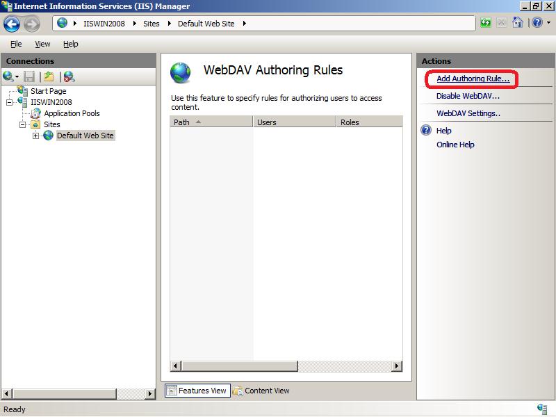 - После включения WebDAV, создадим правила доступа к содержимому, нажав кнопку Add Authoring Rule.