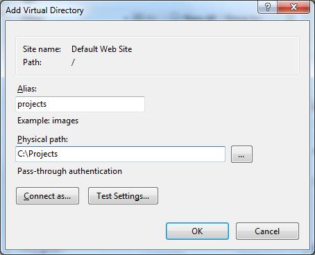 Укажите алиас (имя виртуального каталога IIS) и путь к папке, к которой необходимо открыть доступ и нажмите OK.