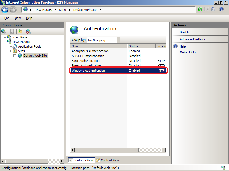- В панели управления IIS выберите опцию Authentication.