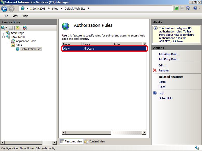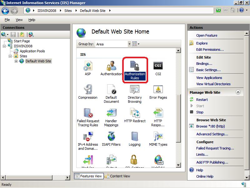- Вернитесь на уровень сайта Default Web Site и выберите Authorization Rules (либо .Net Authorization Rules)