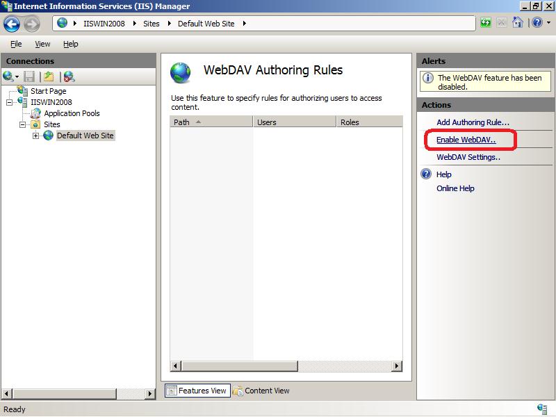 - На странице WebDAV Authoring Rules щелкните в правой колонке(Actions) по сслыке Enable WebDAV
