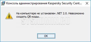 3. Ждем запуска мастера установки консоли. При запуске может появится ошибка «На компьютере не установлен .NET 2.0. Невозможно создать QR-коды«, её можно смело проигнорировать и нажать кнопку «Ок«, на установку она никак не повлияет.