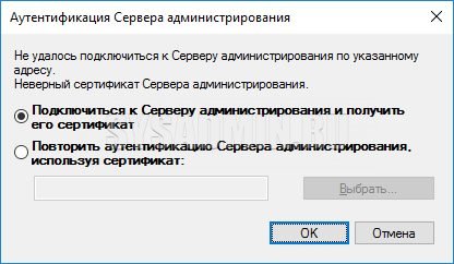 8. Если появляется сообщение о неверном сертификате Сервера администрирования, то в случае наличия такого, выбираем второй пункт и находим сертификат у себя на компьютере. Если же никакого сертификата при себе не имеется, то просто выбираем первый пункт и нажимаем кнопку «Ок.