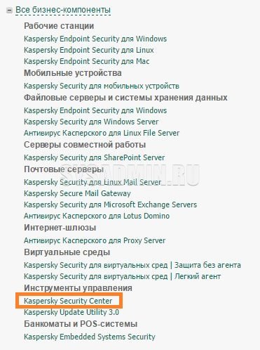 1. На сайте Лаборатории Касперского, в разделе загрузок и дистрибутивов продуктов находим пункт «Все бизнес компоненты«, а в нем Kaspersky Security Center. Загружаем его.