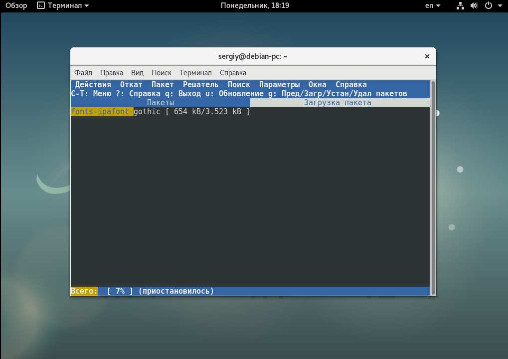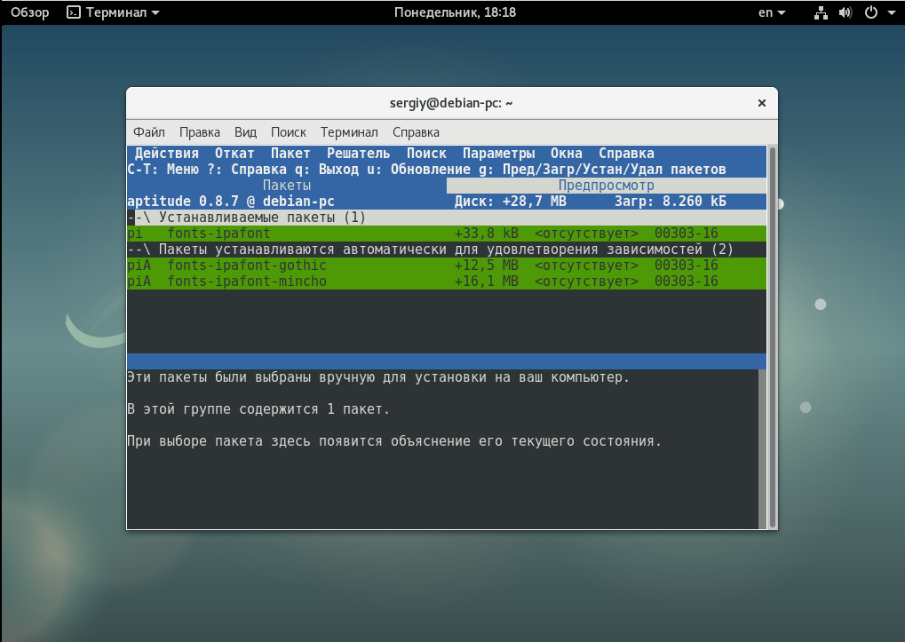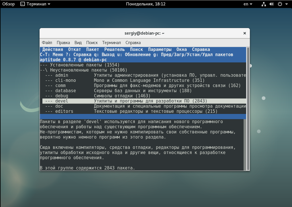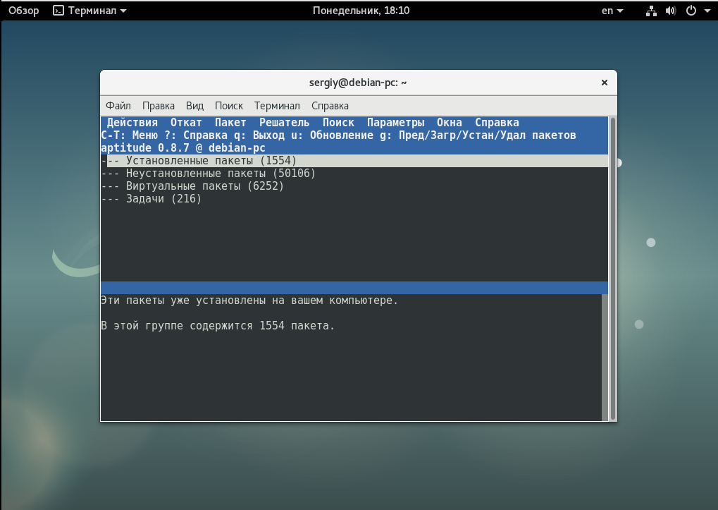 Кроме консольных команд, утилита имеет псевдографический интерфейс, с помощью которого намного удобнее управлять пакетами. Возможно, установка пакетов Debian здесь не так удобна, зато удалить лишние пакеты и посмотреть уже установленные самое оно. Для запуска утилиты выполните: