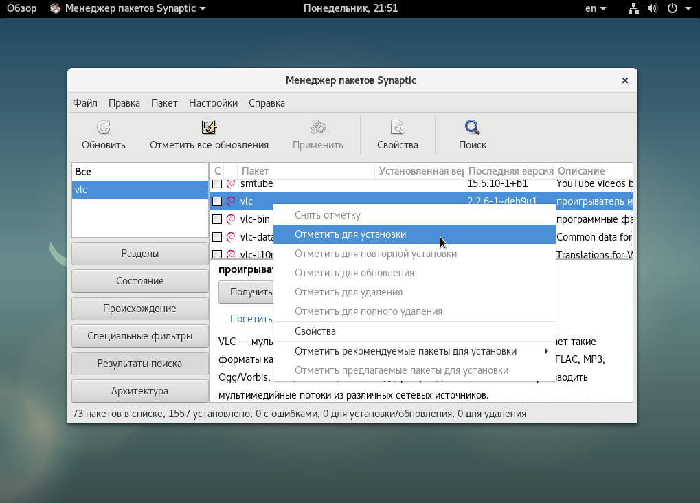 Кликните по нужному пакету правой кнопкой и выберите «Отметить для установки»: