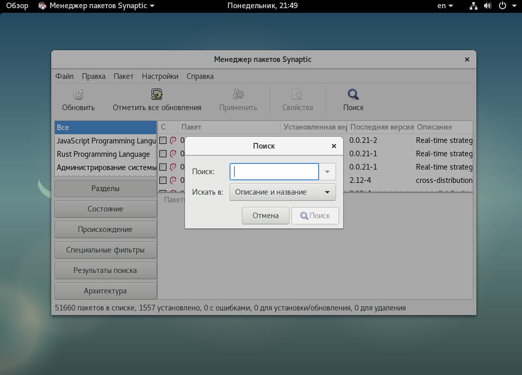 Для полноты статьи давайте еще рассмотрим как выполняется установка приложений через графический интерфейс. Для этого будем использовать программу synaptic. Она уже поставляется вместе с дистрибутивом, можно найти в главном меню: