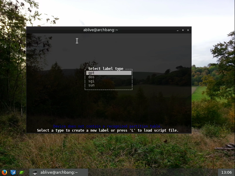 Установка системы на данный момент может быть выполнена с помощью утилиты fast-install. Раньше был пошаговый установщик, но в процессе отказа от systemd он был утерян. Чтобы установить ArchBang в /mnt выполните: