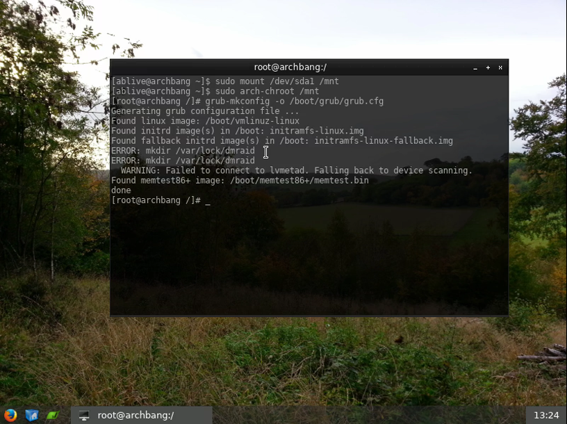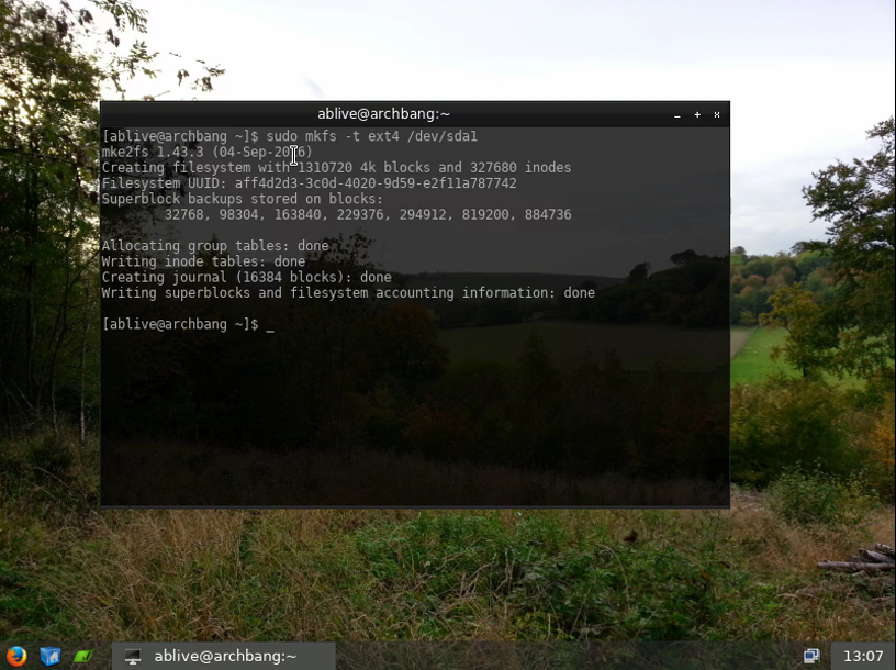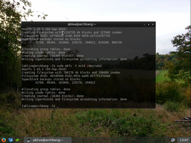 Перед тем как запустить установщик ArchBang нам осталось подключить созданные разделы к файловой системе. Монтируем корень в /mnt, а домашний раздел в /mnt/home: