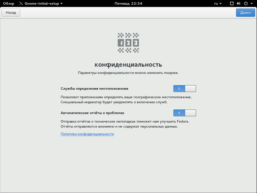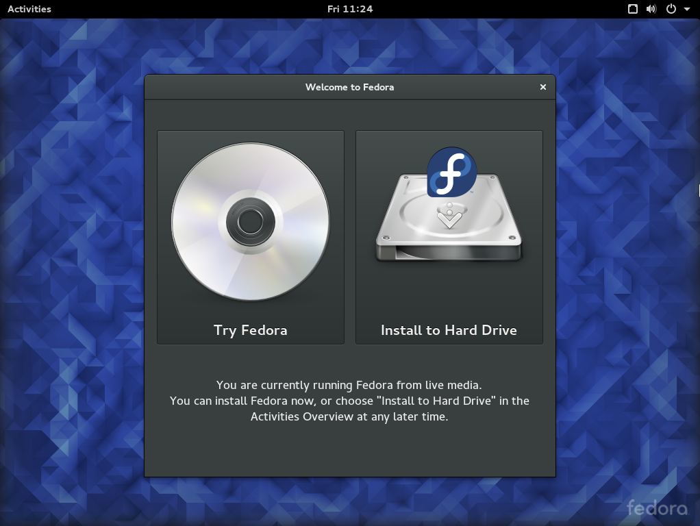Когда Fedora 23 полностью загрузится, откроется окно с предложением познакомиться с системой или сразу запустить установщик: