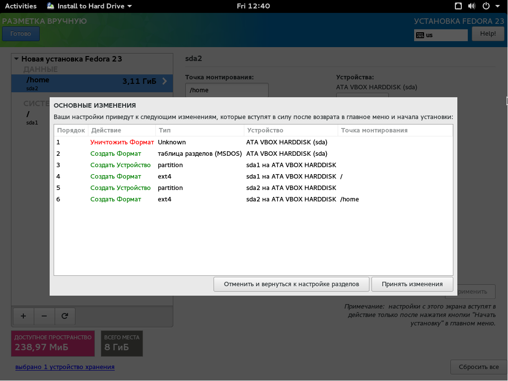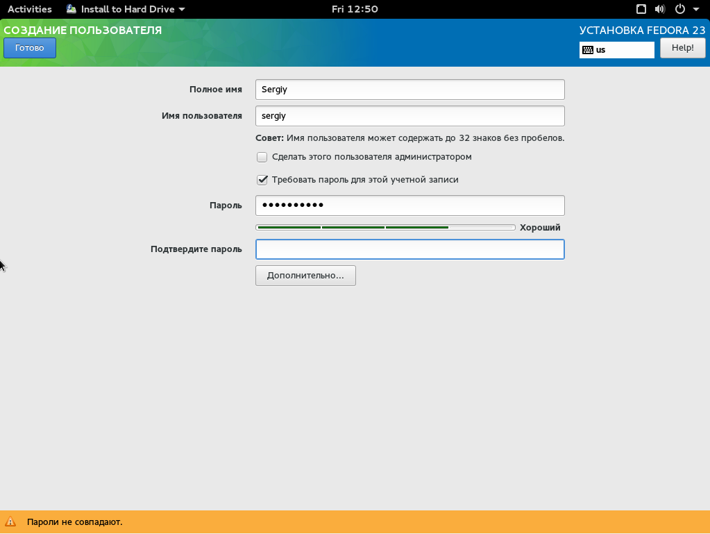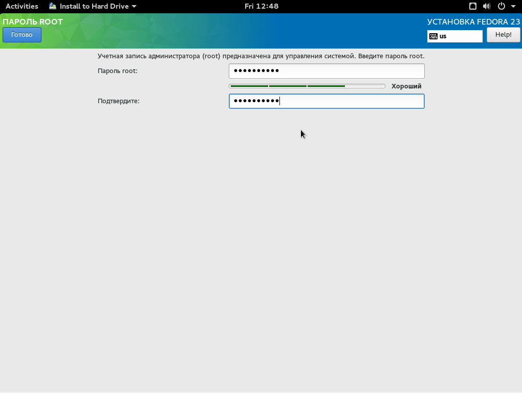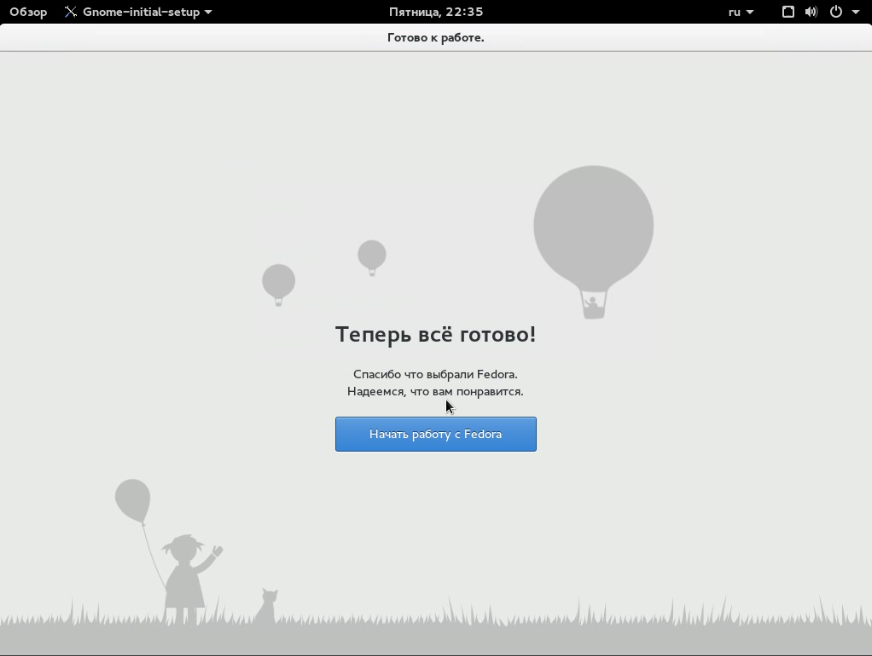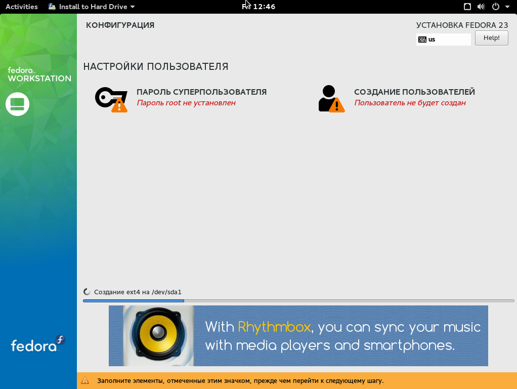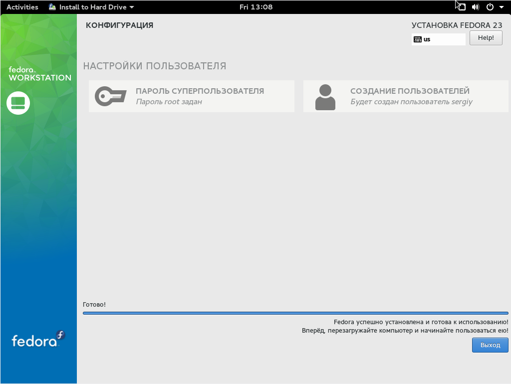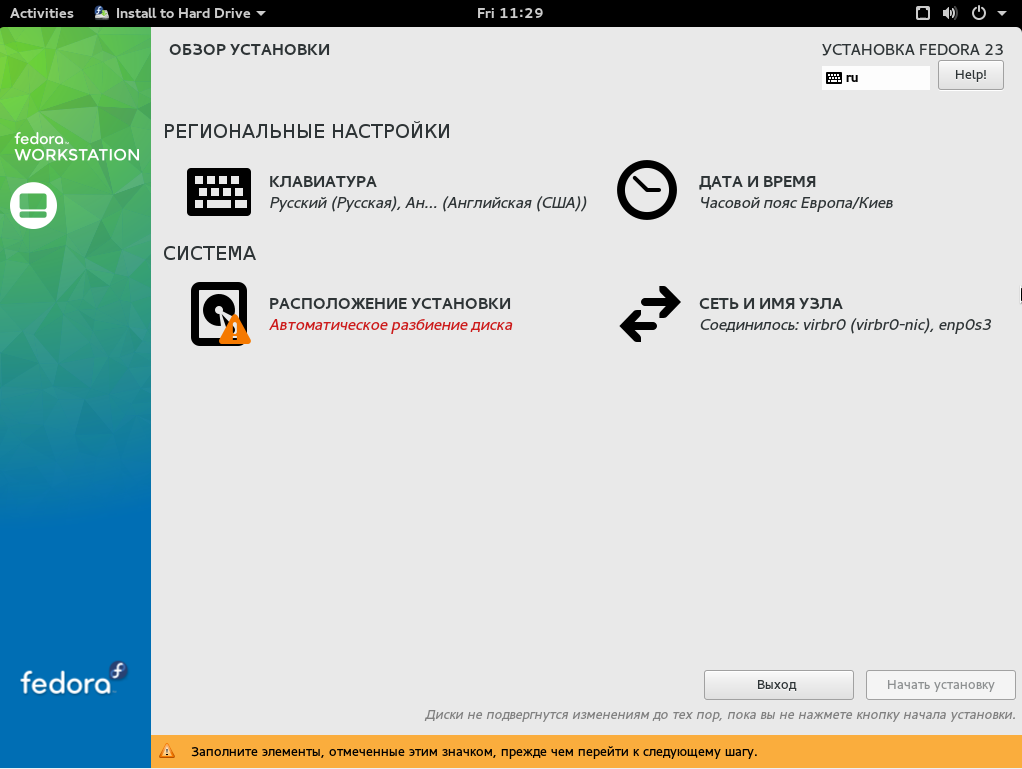 Когда все настройки завершены, нажмите начать установку, чтобы запустить установку Fedora 23