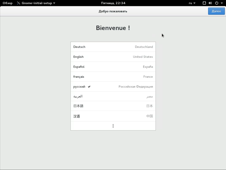 Выберите язык, на котором будет установлена система и нажмите Продолжить:
