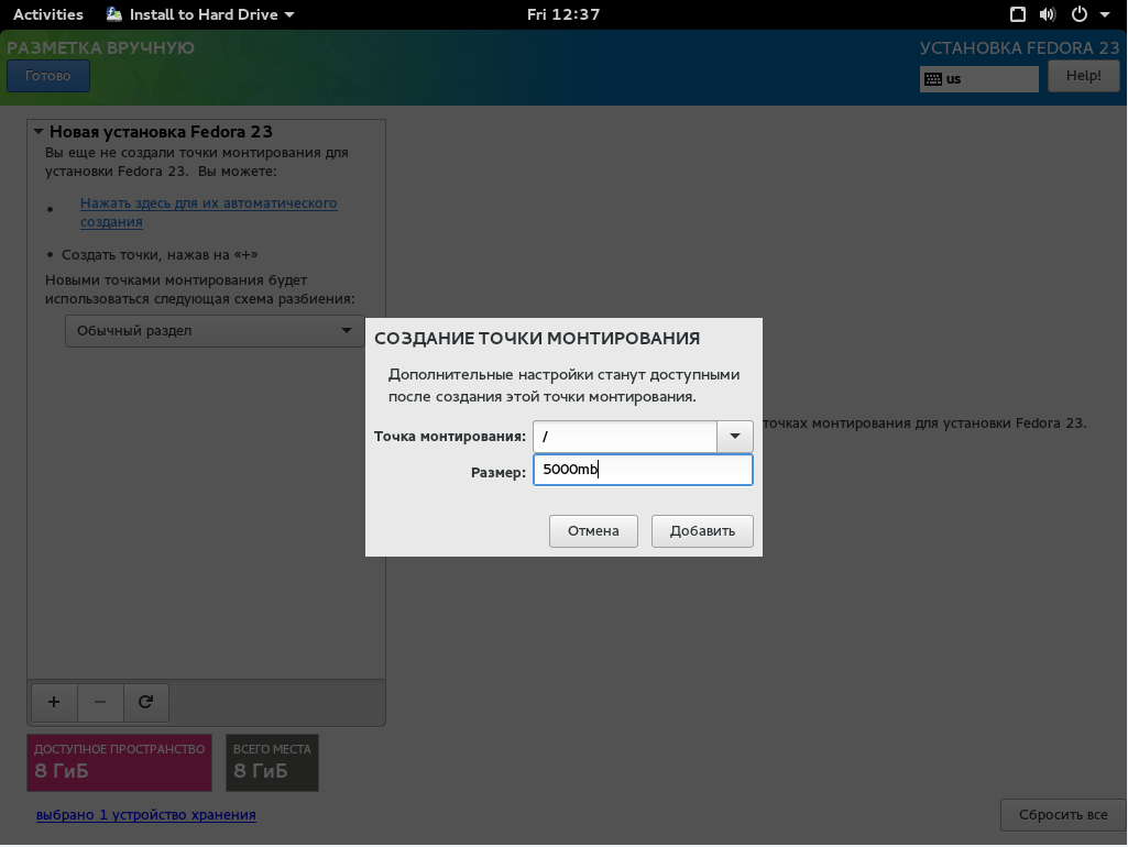 Выберите пункт настройка диска, затем кликните по диску, на который будет установлена Fedora 23.