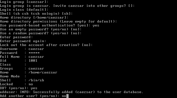 Дальше установщик спросит вас не желаете ли вы добавить к системе еще пользователей. Выберите «yes» и введите всю необходимую информацию о пользователе. Безопаснее всего оставить все поля по умолчанию, для этого достаточно нажимать «Enter»: