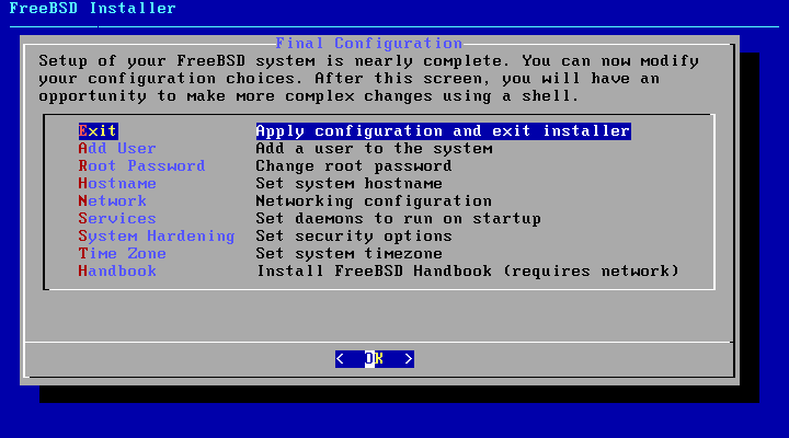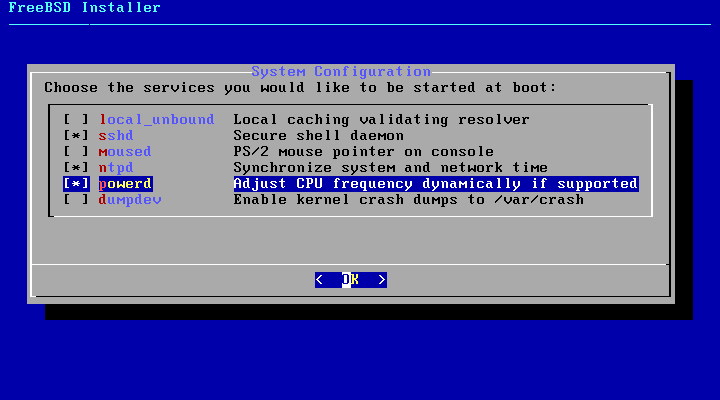 Дальше нужно выбрать какие сервисы будут загружаться по умолчанию при старте системы. Например, SSH, NTP и Powerd. Последний позволяет автоматически регулировать частоту процессора в зависимости от нагрузки на систему.