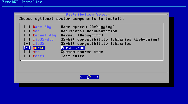 На следующем экране вам предстоит выбрать компоненты системы, которые вы хотите установить FreeBSD 11 на свой компьютер. Для того, чтобы отметить компонент нажмите «Пробел». Для сервера достаточно оставить библиотеки совместимости lib32 и Ports.