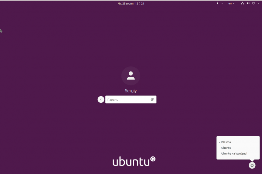 Пакетный менеджер может выдать ещё несколько окон с предупреждениями, в них можно нажимать Ок. Остается только перезагрузить компьютер и наслаждаться только что установленной KDE Plasma. После перезагрузки вы сможете выбрать оболочку входа. Для этого нажмите на шестеренку в низу экрана: