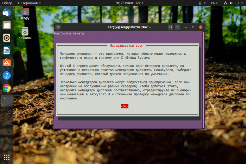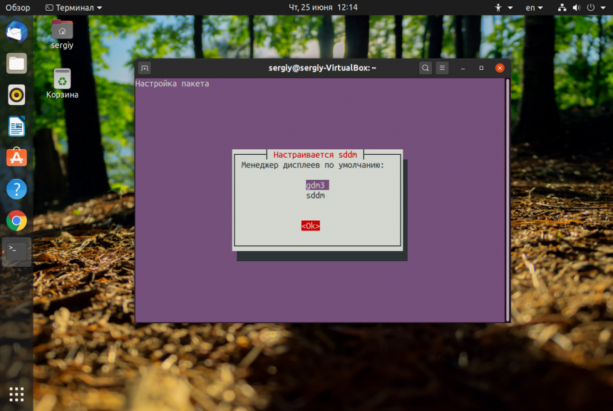 Во время установки системе нужно будет настроить менеджер входа в систему. Нажмите ОК, а в следующем окне выберите Gdm, чтобы использовать стандартный менеджер входа Ubuntu: