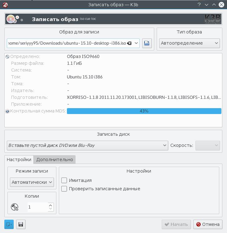 Также записать Kubuntu на диск можно и в терминале: