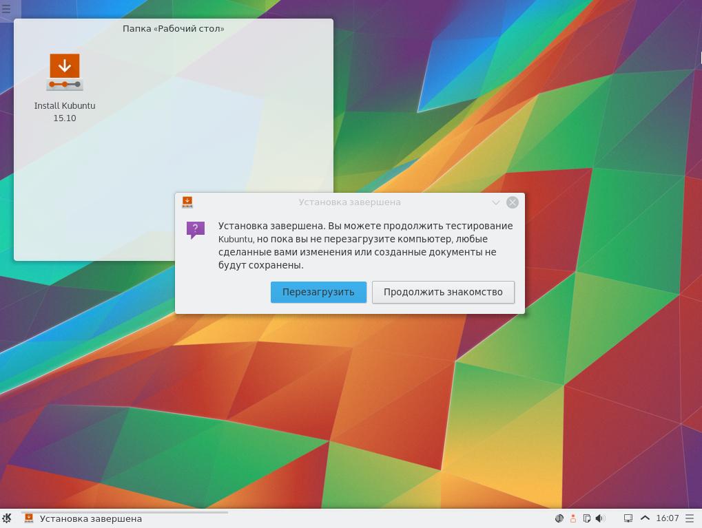 Нам остается перезагрузить компьютер и наслаждаться только что установленной системой. В этой статье мы пошагово разобрали установку Kubuntu 15.10, но если у вас остались вопросы, оставляйте комментарии, обязательно отвечу.