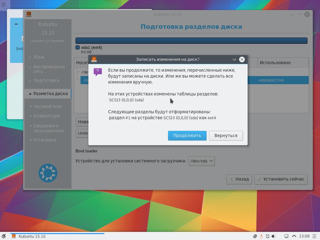 Дальше компьютер перезагрузится, и вместо вашей обычной ОС запустится установка Kubuntu 15.10.
