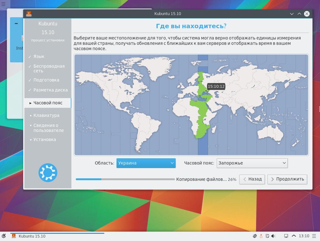 После нажатия кнопки продолжить начнется установка, но она будет идти в фоне, а нам предстоит сделать еще несколько настроек, первая из которых часовой пояс, выберите место на карте и установщик определит нужный пояс, например, у меня Украина, Запорожье: