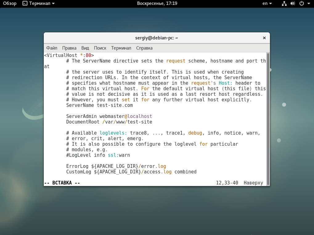 Теперь полученный файл нужно отредактировать. Нас будут интересовать директивы ServerName и DocumentRoot. Установите для них правильные значения: