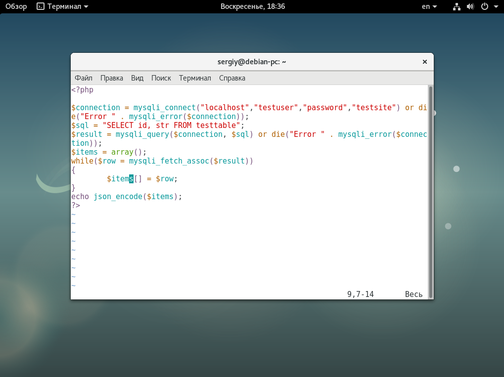 Теперь, чтобы убедиться что все работает, мы попытаемся получить данные из mysql через PHP. Для этого создадим небольшой скрипт. Он будет подключаться к базе данных и читать по порядку записи из таблицы:
