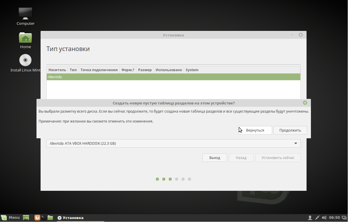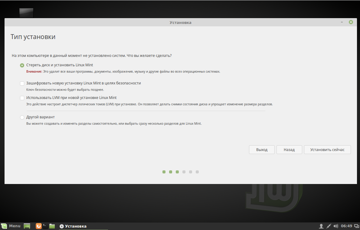 Если у вас чистый диск, выберите Стереть диск и установить Linux MInt, если же вам нужно две операционные системы или более тонкая настройка, выбирайте Другой вариант и нажмите далее.