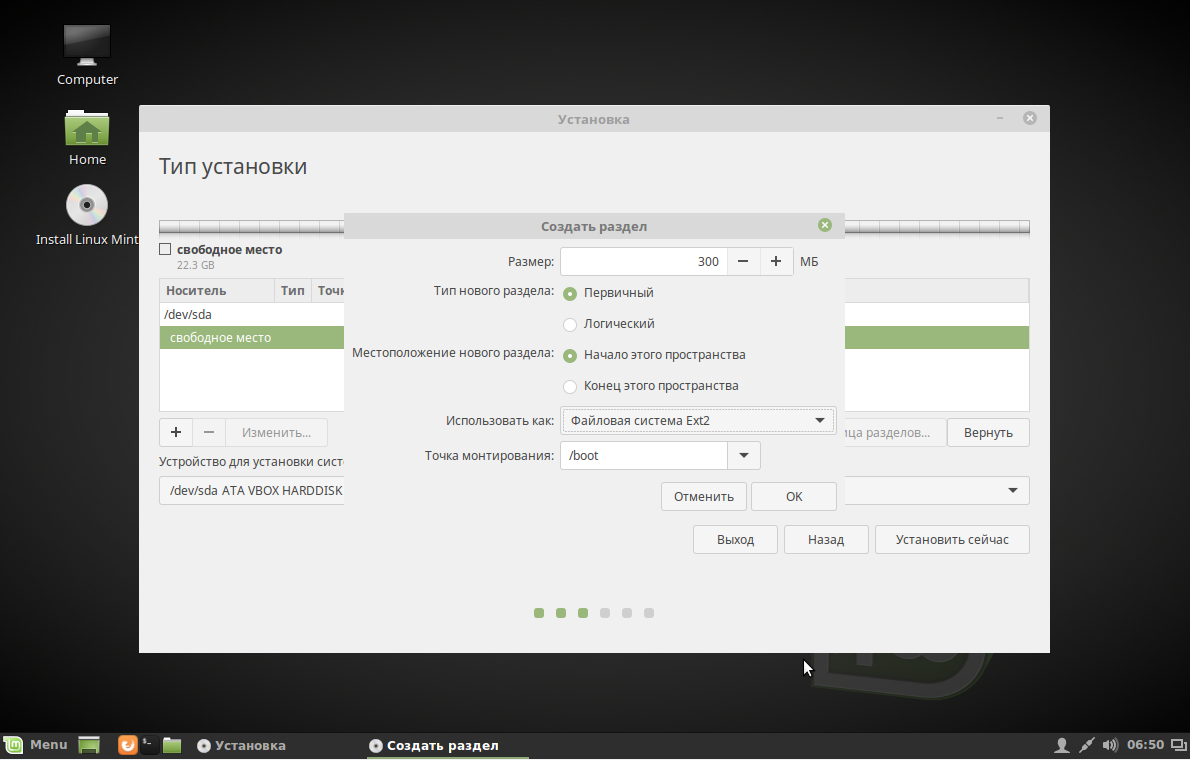 Сначала создадим раздел для загрузчика. Нажмите значок +, в открывшимся окне выберите размер раздела 300 Мб — больше не понадобится, файловая система ext2, точка монтирования /boot. Последним параметром мы и сообщаем системе, что этот раздел нужно использовать как загрузчик: