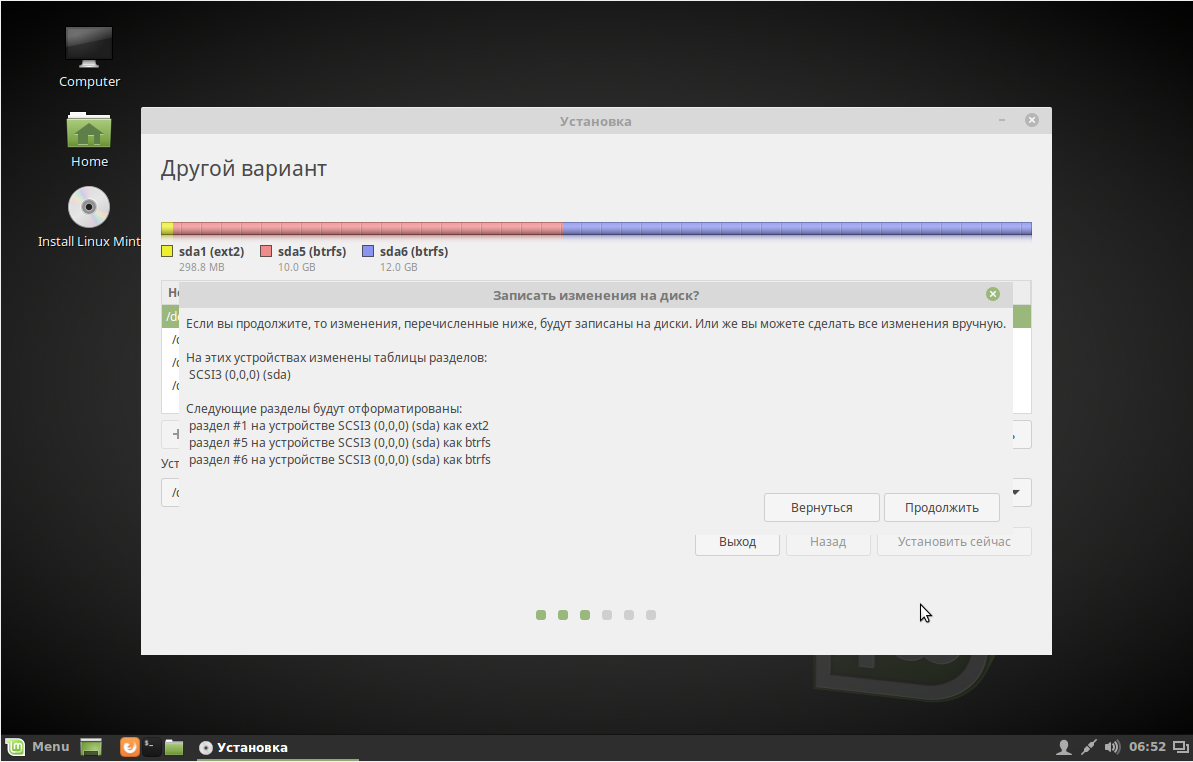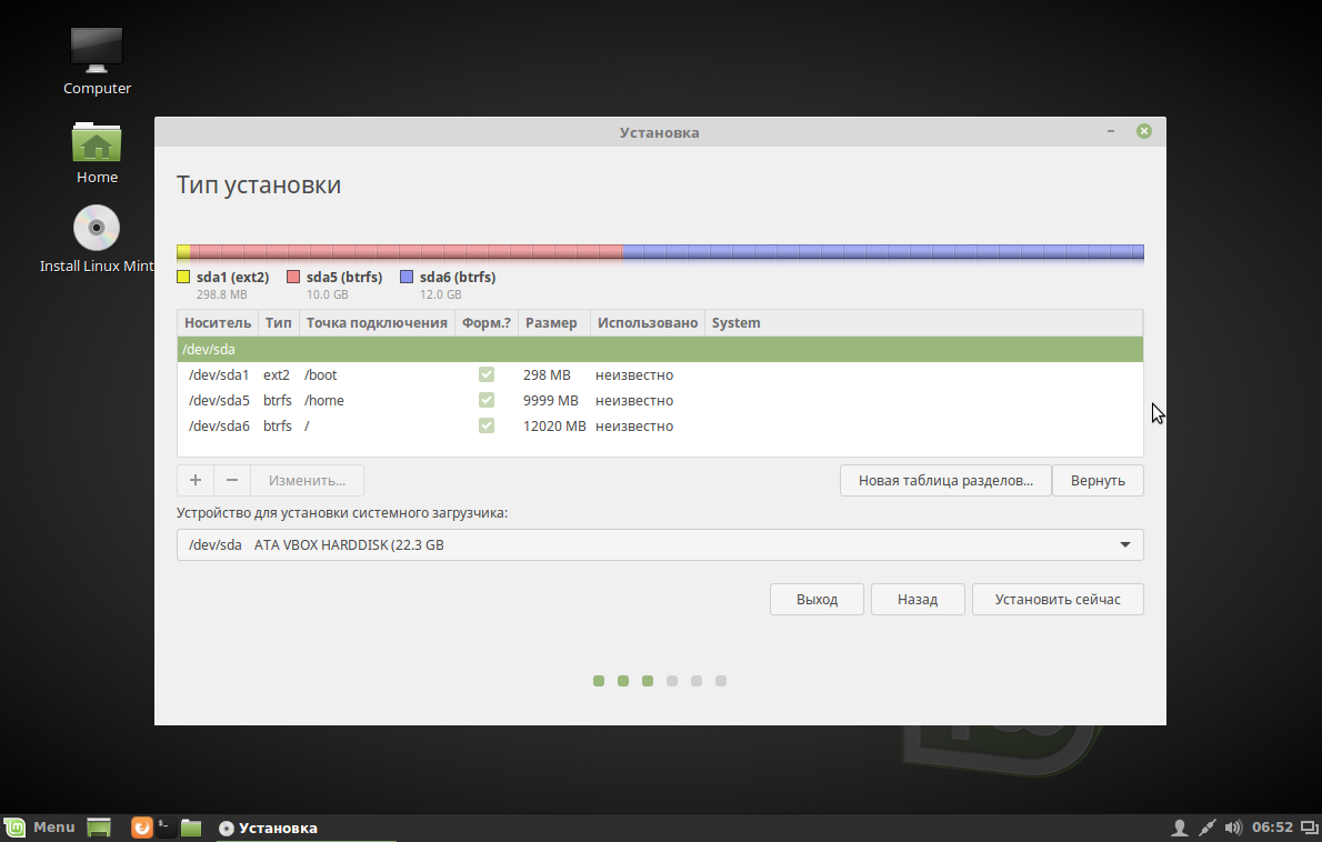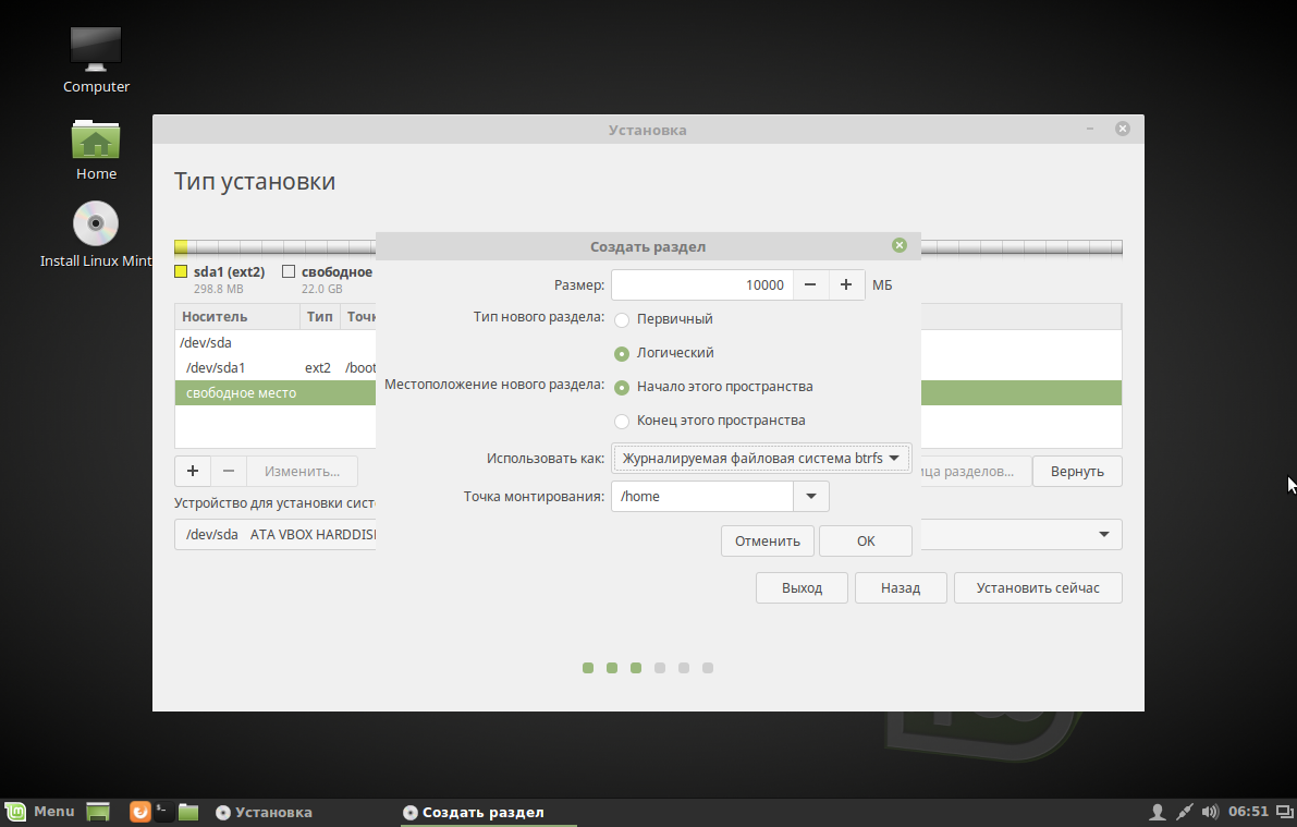 Я отделяю под системный раздел минимум 10 Гб, потому что это тестовая установка, но вам рекомендую выделить не менее 50 Гб. Файловая система ext4, но, если вы уже не новичок, можете использовать btrfs. Точка монтирования — корень /.