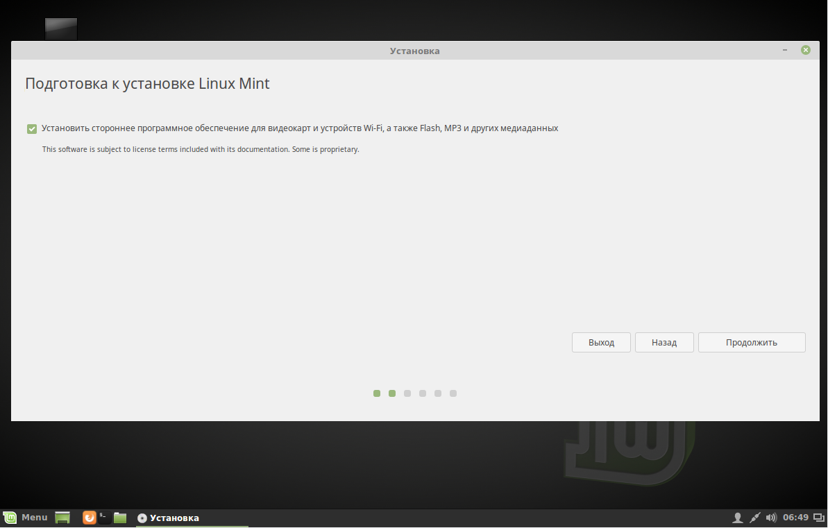 Установите галочку, чтобы установить Linux Mint 18 вместе с проприетарными драйверами для видеокарт и Wi-Fi-адаптеров: