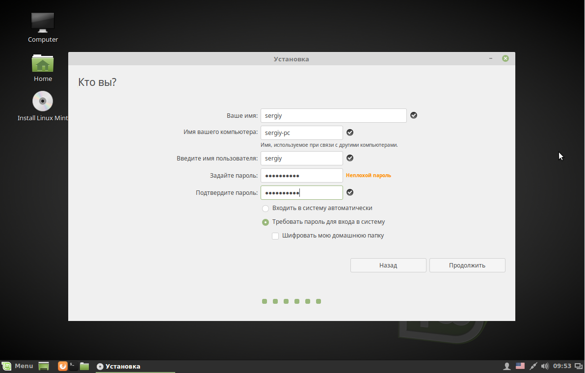 Создайте нового пользователя, который будет использовать систему. Введите ваше имя, можно по-русски, имя компьютера, только по-английски, и имя пользователя, по-английски и с маленькой буквы. Придумайте достаточно сложный пароль: