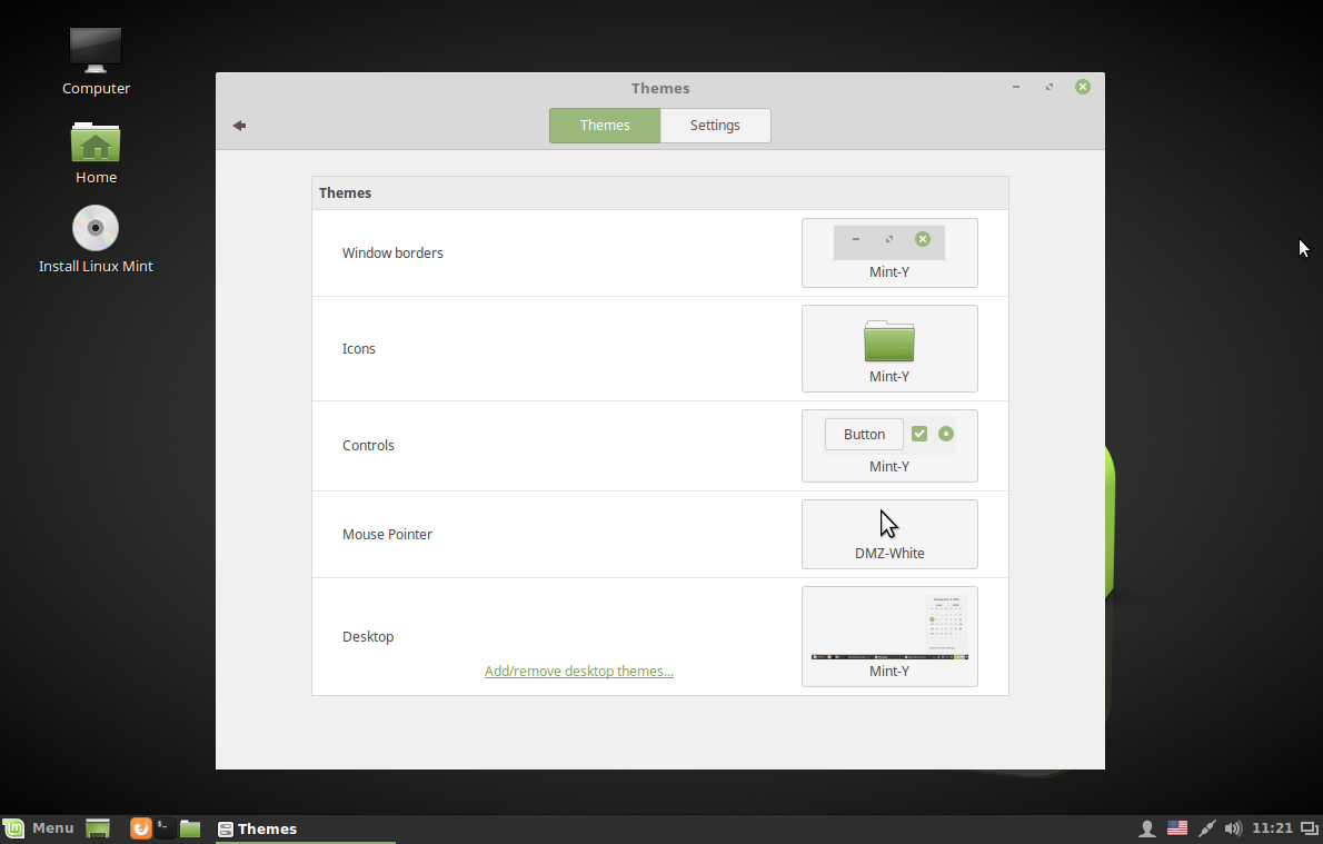 В открывшимся окне кнопка Назад, а затем откройте пункт Themes. Здесь нужно все компоненты установить в значение Mint-Y: