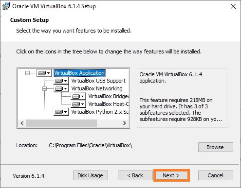 - На следующем окне можно детально настроить установку VirtualBox. Например можно выбрать необходимые компоненты VirtualBox для установки (по умолчанию выбраны все, что является оптимальным вариантом), либо сменить директорию для установки программы (за это отвечает кнопка «Browse«). Настроив установку, нужно нажать кнопку «Next».