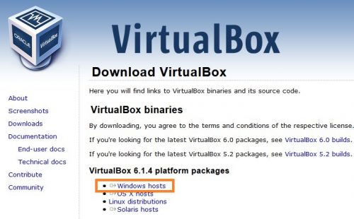Взять установщик можно с официального сайта — virtualbox.org. На этой странице нужно найти пункт Windows hosts, и кликнуть на него (после чего начнется скачивание файла установщика).