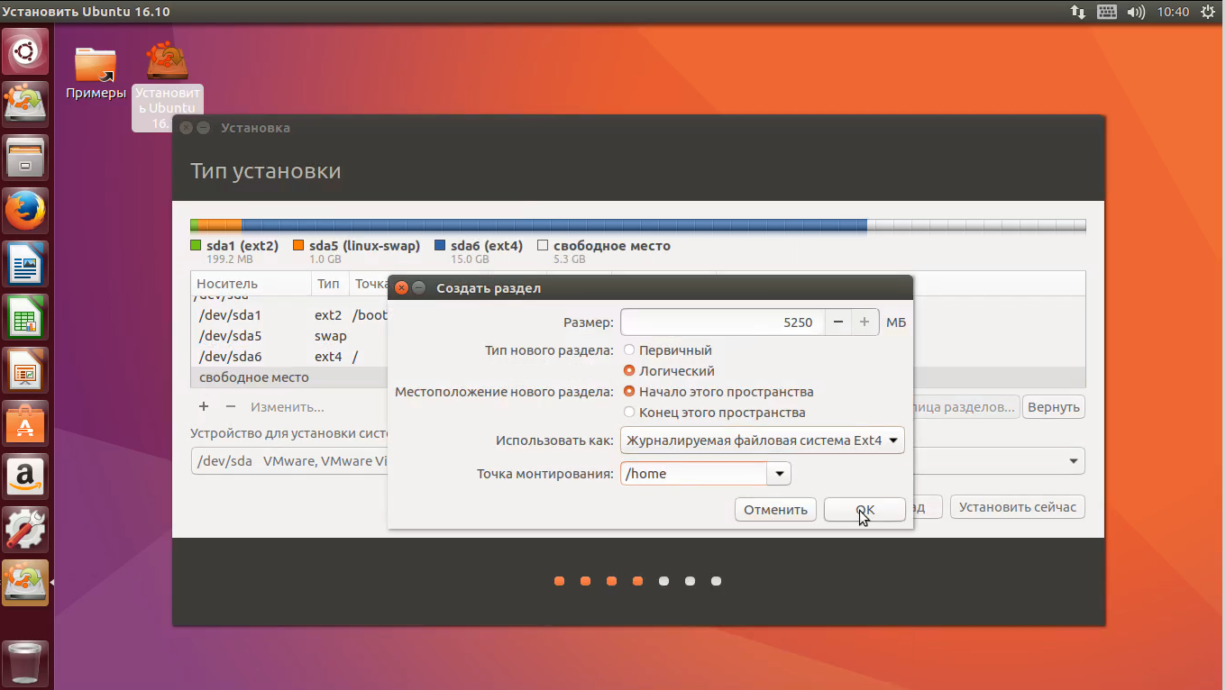Под домашний раздел выделите все доступное место, здесь будут находится все ваши файлы, фото, музыка, документы, фильмы. Точка монтирования — /home: