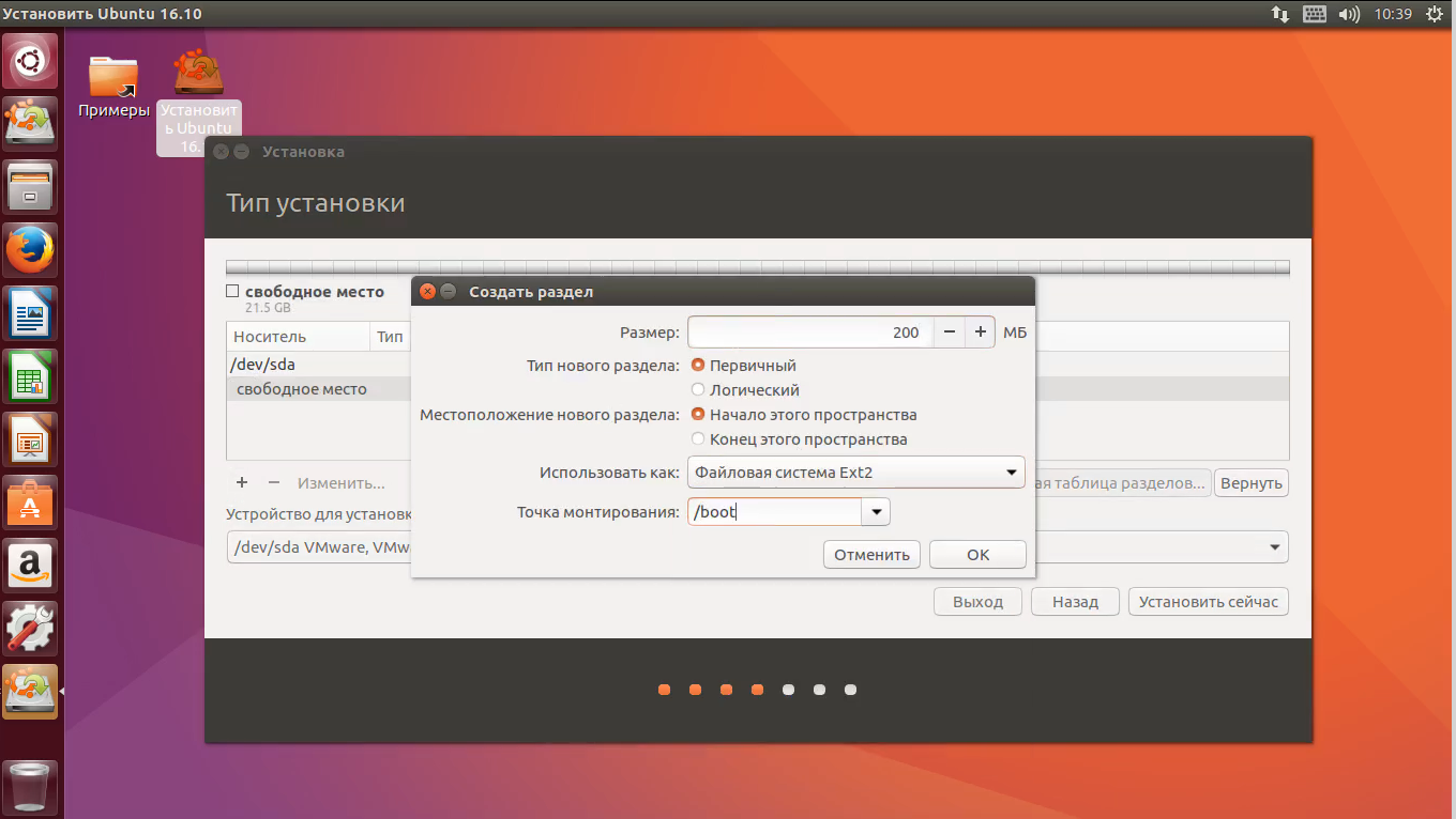Размер раздела 200 Мегабайт, а точка монтирования /boot. Файловая система ext2.
