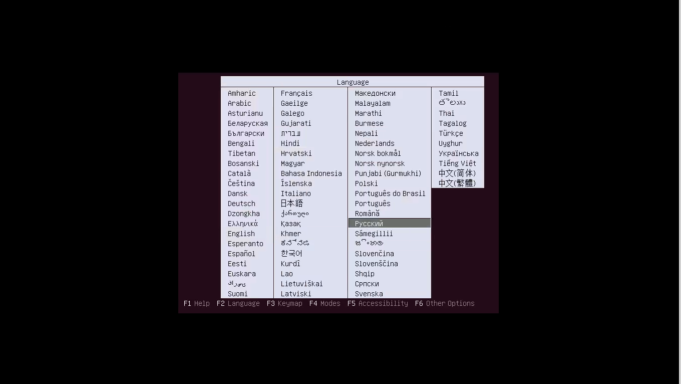 Затем выберите язык, перемещаться можно с помощью клавиш стрелок: