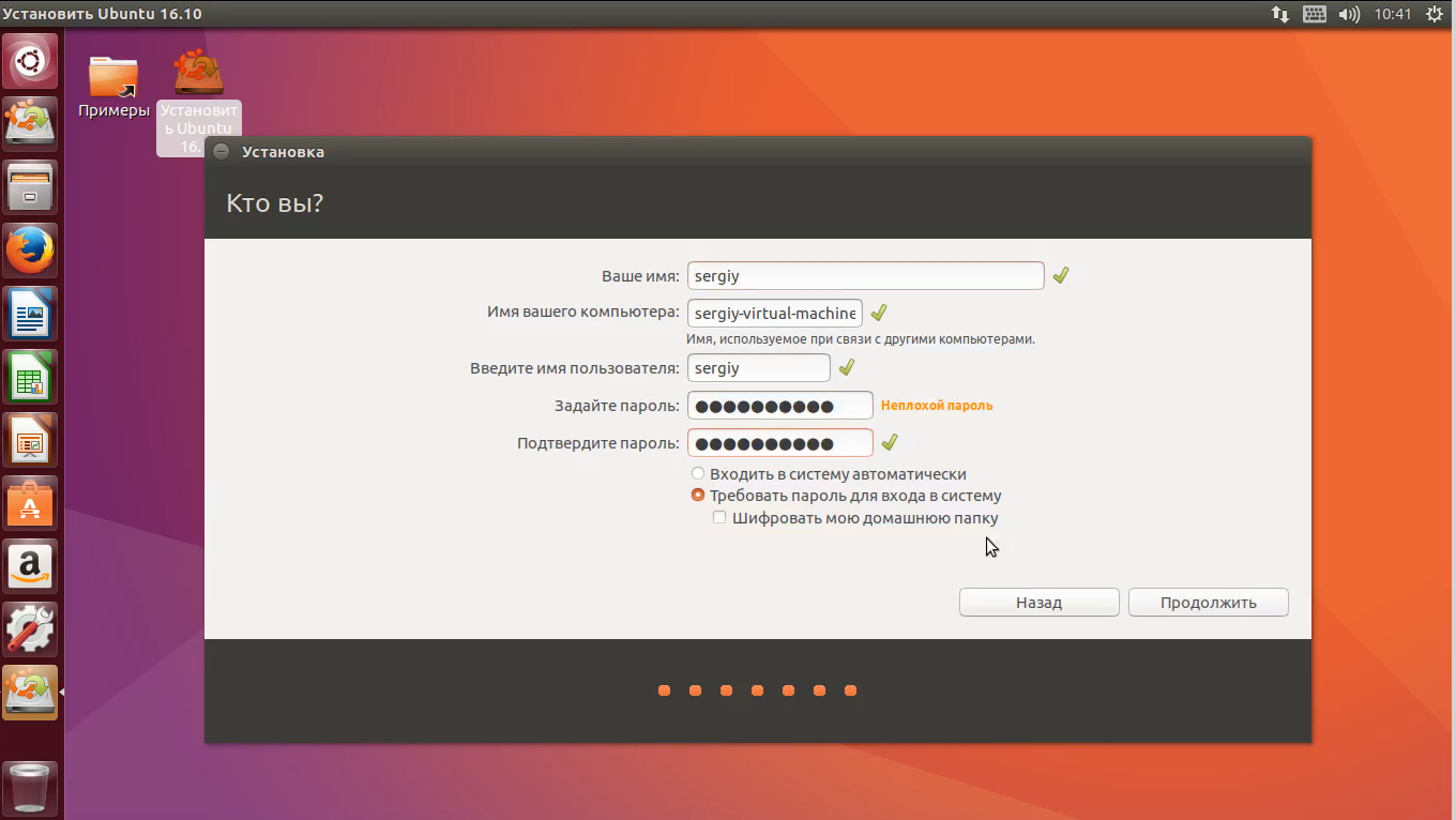 Последним шагом будет создание пользователя. Здесь вам нужно ввести имя, логин и пароль. Логин будет использоваться для входа в систему и может содержать только английские буквы нижнего регистра и цифры. Также на этом шаге вы можете настроить шифрование домашней папки и автоматический вход (но только, если у вас один пользователь):