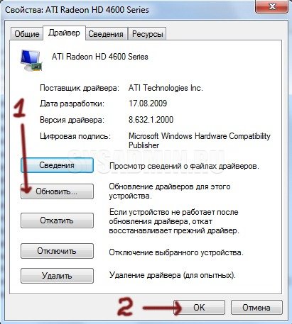 В среднем окне заходим в видеоадапетры и нажимаем на название видеокарты. В выскочившем окне переходим во вкладку “Драйвер”.