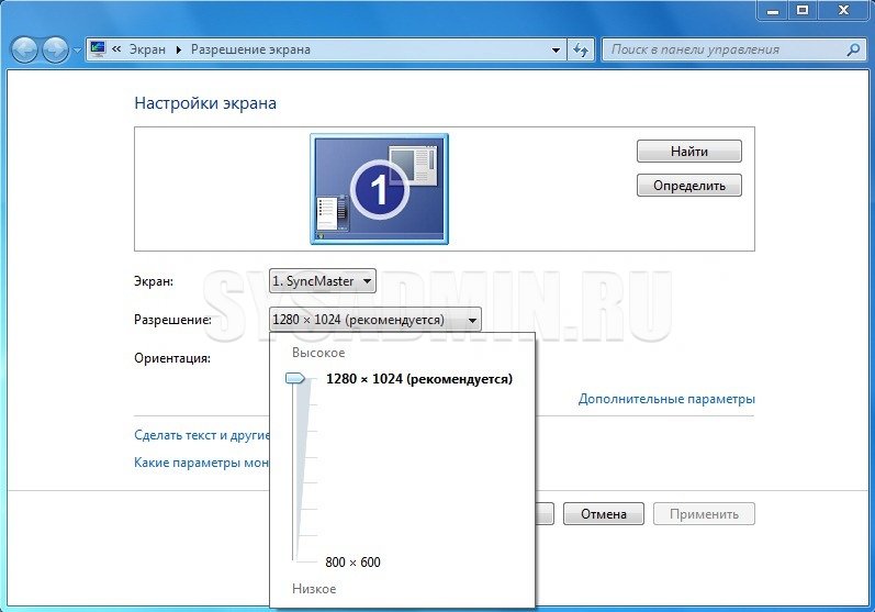 5) Если изображение вы все-таки увидели, но оно с искажениями, то идем опять же в контекстное меню рабочего стола – Разрешение экрана. Здесь нужно выставить стандартное разрешение вашего монитора, указанное в инструкции.